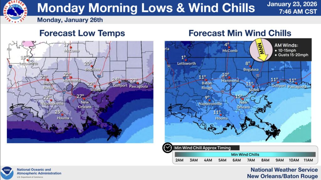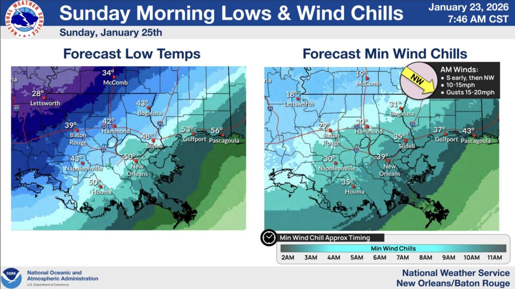A significant cold snap is forecast to affect southeast Louisiana beginning this weekend and continuing into early next week. Regional meteorologists report that a strong cold front will move into southern Louisiana, bringing temperatures near or below freezing during the overnight hours. This change comes on the heels of a larger winter weather pattern affecting much of the Southern United States as part of an active winter weather system this month.