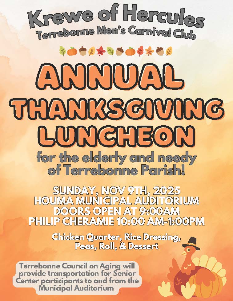 As we move into the season of gratitude, HTHA would like to acknowledge the annual Thanksgiving Luncheon for the elderly and those in need of Terrebonne Parish, hosted by the Terrebonne Men’s Carnival Club and the Krewe of Hercules.